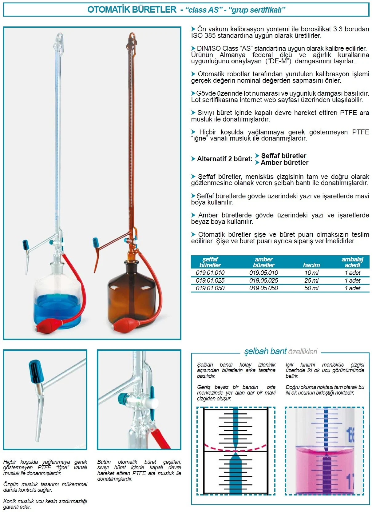 Otomatik büretler şişe ve büret puarı olmaksızın teslim edilir.