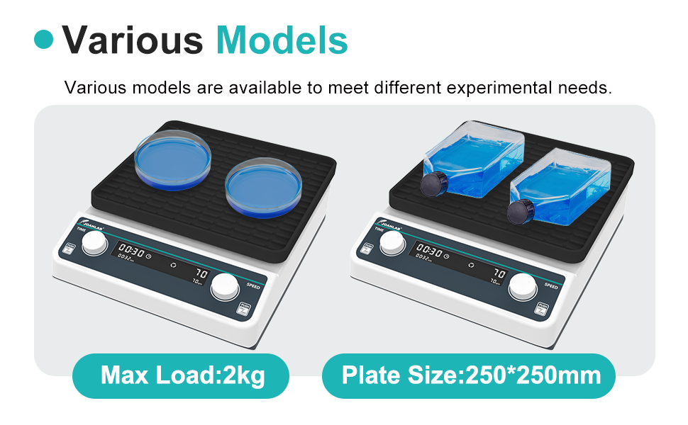 1.Hız: Tüm modeller için 40-200rpm 2.Hız ve zaman kontrollü dijital panel 3.Çalışma tavası boyutu 25X25cm/32X32cm, maksimum yük 5KG 4.Sürekli çalışma ve zamanlı çalışma aralığı 1 dak-23sa59dak 5.DC fırçasız motor, güvenli , uzun ömürlü ve bakım gerektirmez. Sessiz ve istikrarlı çalışma